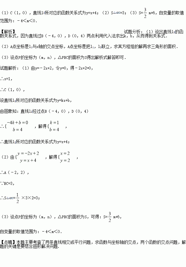 如图,直线l1,l2交于点A,直线l2与x轴、y轴分别交于点B(﹣4,0)、D(0,4),直线l1所对应的函数关系式为y=﹣2x﹣2.