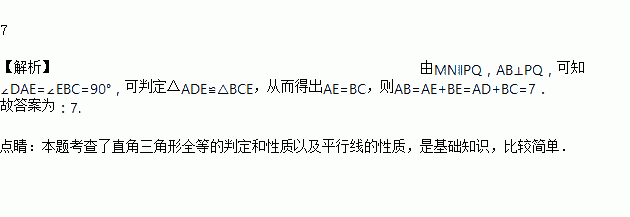 如图,MN∥PQ,AB⊥PQ,点A,D,B,C分别在直线MN和PQ上,点E在AB上,AD+BC=7,AD=EB,DE=EC,则AB=_____.