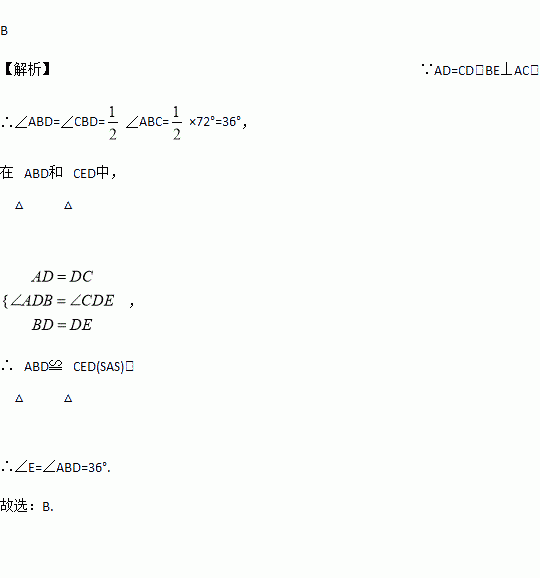 如图,BE⊥AC于点D,且AD=CD,BD=ED.若∠ABC=72°,则∠E等于( )
