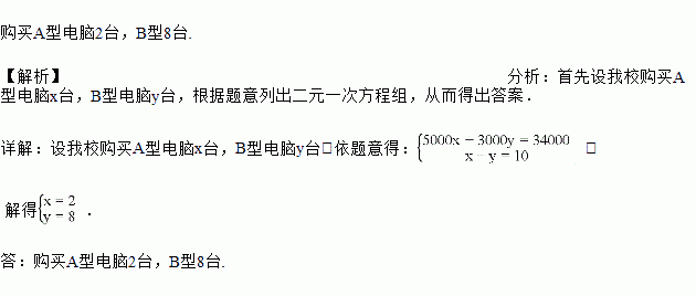 某电脑公司有A型、B型两种型号的电脑,其中A型电脑每台5000元,B型电脑每台3000元。我校购买10台电脑共花费34000元。问我校购买A型、B型电脑分别多少台?
