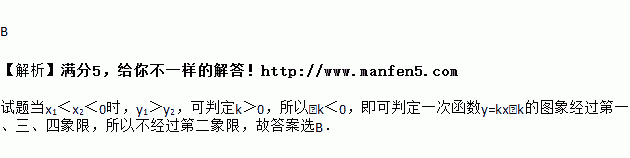 (k≠0)图象上的两个点,当x1<x2<0时,y1>y2,那么一次函数y=kx-k的图象不经过( )