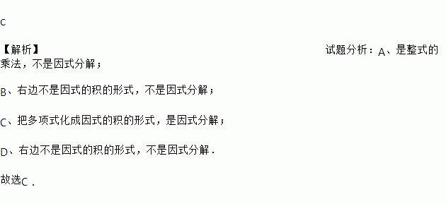 C 【解析】试题分析:A、是整式的乘法,不是因式分解; B、右边不是因式的积的形式,不是因式分解; C、把多项式化成因式的积的形式,是因式分解; D、右边不是因式的积的形式,不是因式分解. 故选C.