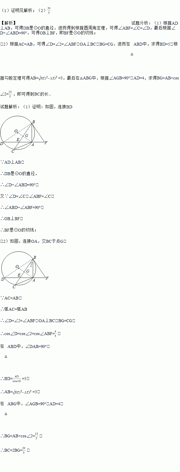 如图,△ABC内接于⊙O,AB=AC,过点A作AD⊥AB交⊙O于点D,交BC于点E,点F在DA的延长线上,且∠ABF=∠C .