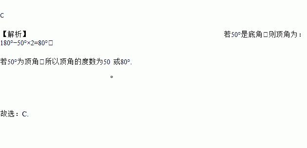 C 【解析】若50°是底角,则顶角为:180°?50°×2=80°; 若50°为顶角,所以顶角的度数为50°或80°. 故选:C.