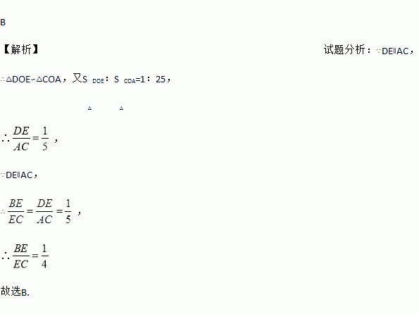 如图,D、E分别是△ABC的边AB、BC上的点,且DE∥AC,AE、CD相交于点O,若S△DOE:S△COA=1:25,则的值为( )