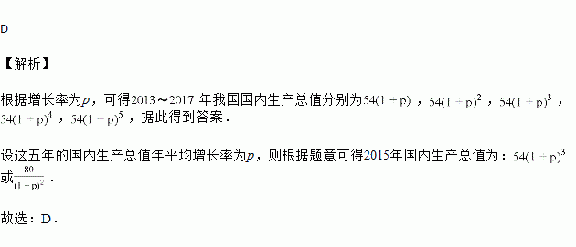 国家统计局2017年年底发布数据,我国国内生产总值从2012年的54万亿元增长到2017年的80万亿元,且每年的经济增量基本持平,多项经济指标好于预期,设这五年的国内生产总值年平均增长率为p,则根据题中信息,2015年国内生产总值为多少万亿元?![]()