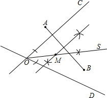 某地区要在区域S内 (即∠COD内部) 建一个超市M,如图所示,按照要求,超市M到两个新建的居民小区A,B的距离相等,到两条公路OC,OD的距离也相等.这个超市应该建在何处?(要求:尺规作图,不写