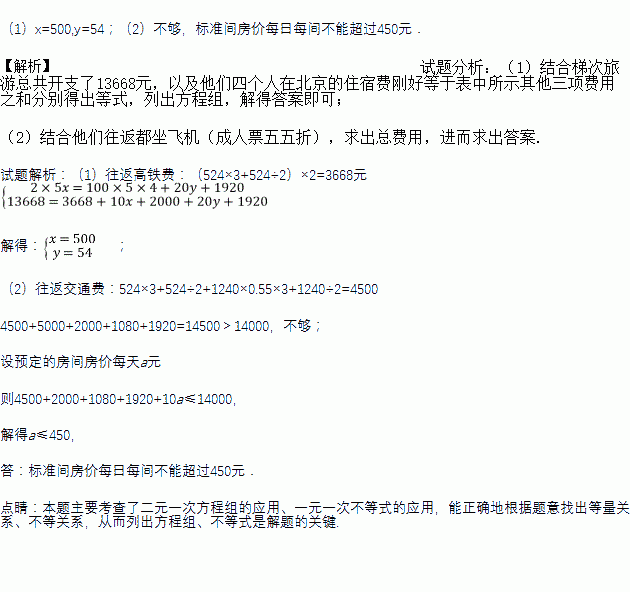 (2)若去时坐火车,回来坐飞机,且飞机成人票打五五折,其他开支不变,他们准备了14000元,是否够用? 如果不够,他们准备不再增加开支,而是压缩住宿的费用,请问他们预定的标准间房价每天不能超过多少元?