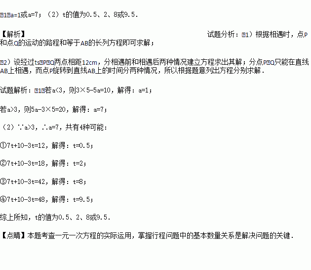 如图,已知一周长为30cm的圆形轨道上有相距10cm的A、B两点 (备注:圆形轨道上两点的距离是指圆上这两点间较短部分展直后的线段长).动点P从A点出发,以a cm/s的速度,在轨道上按逆时针方向运动,与此同时,动点Q从B出发,以3 cm/s的速度,按同样的方向运动.设运动时间为t (s),当t = 5时,动点P、Q第一次相遇.
