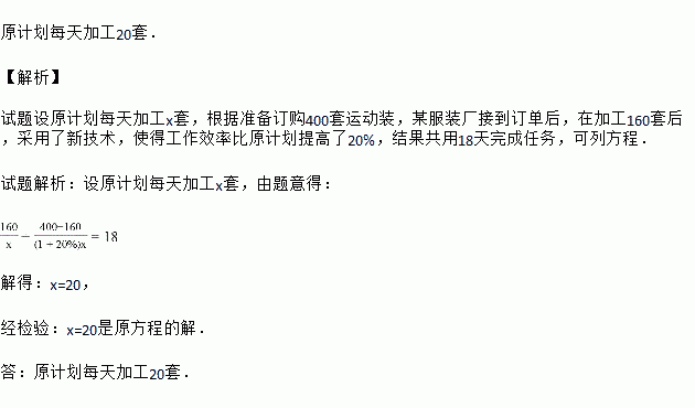 某服装厂准备加工400套运动装,在加工完160套后,采用新技术,使得工作效率比原计划提高了20%,结果共用了18天完成任务,那么原计划每天加工服装多少套?