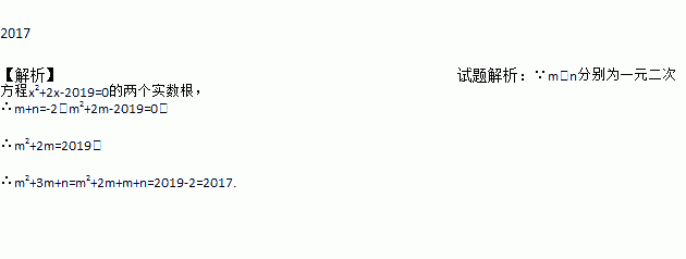 设分别为一元二次方程x2+2x-2019=0的两个实数根,则m2+3m+n=____.
