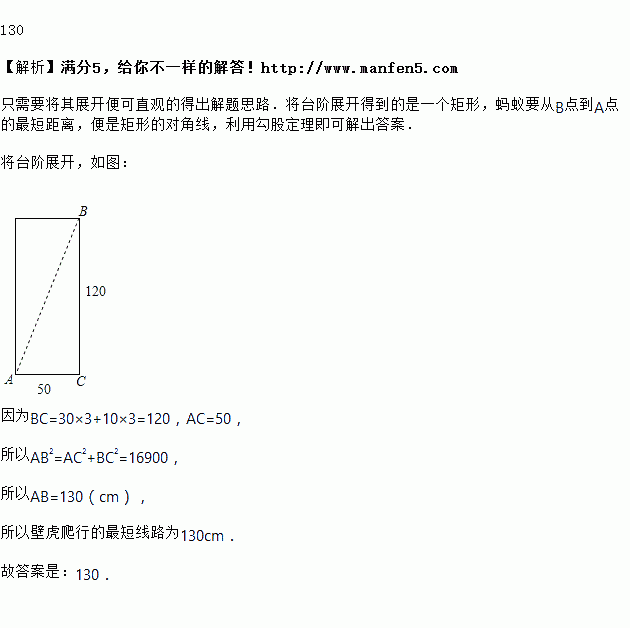 如图:一个三级台阶,它的每一级的长,宽和高分别是50cm,30cm,10cm,A和B是这个台阶的两个相对的端点,A点上有一只壁虎,它想到B点去吃可口的食物,请你想一想,这只壁虎从A点出发,沿着台阶面爬到B点,最短路线的长是______________cm.