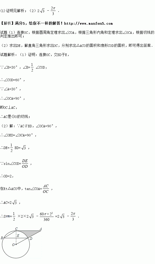 (2)求由线段AC、AD与弧CD所围成的阴影部分的面积(结果保留π)。
