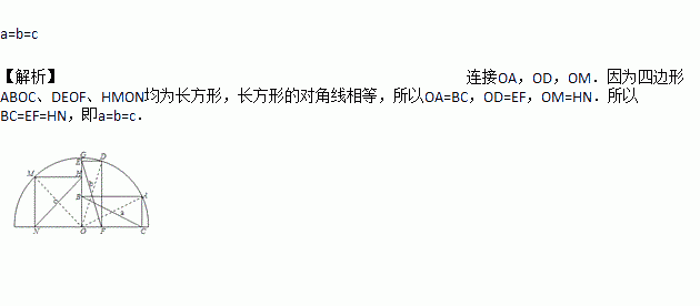 如图,点A、D、G、M在半圆O上,四边形ABOC、DEOF、HMNO均为矩形,设BC=a,EF=b,NH=c,则a、b、c的大小是_________.