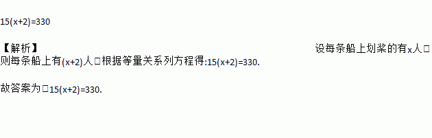 15(x+2)=330 【解析】设每条船上划桨的有x人,则每条船上有(x+2)人,根据等量关系列方程得:15(x+2)=330. 故答案为:15(x+2)=330.