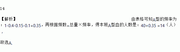 王老师对本班40名学生的血型作了统计,列出如下的统计表,则本班A型血的人数是____人.