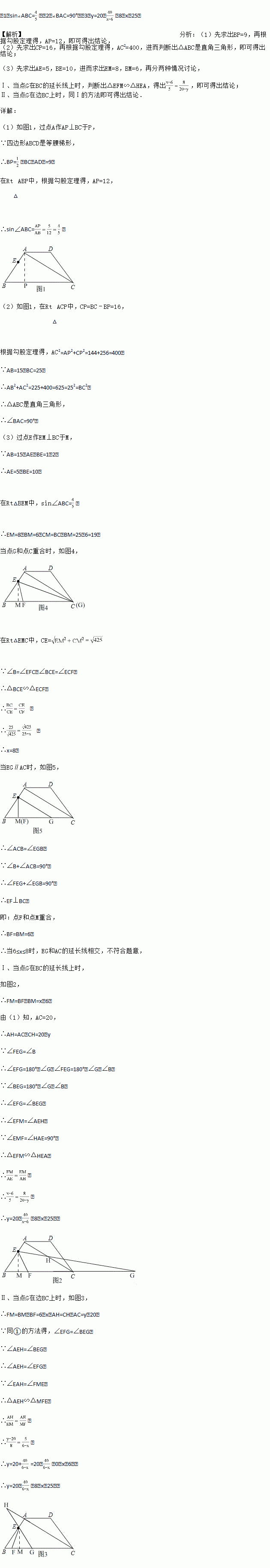 如图,等腰梯形ABCD中,AD∥BC,AD=7,AB=CD=15,BC=25,E为腰AB上一点且AE:BE=1:2,F为BC一动点,∠FEG=∠B,EG交射线BC于G,直线EG交射线CA于H.