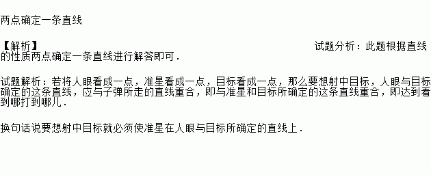 两点确定一条直线 【解析】试题分析:此题根据直线的性质两点确定一条直线进行解答即可. 试题解析:若将人眼看成一点,准星看成一点,目标看成一点,那么要想射中目标,人眼与目标确定的这条直线,应与子弹所走的直线重合,即与准星和目标所确定的这条直线重合,即达到看到哪打到哪儿. 换句话说要想射中目标就必须使准星在人眼与目标所确定的直线上.下面两个圆圈分别表示负数集合和整数集合,请在这两个圆圈内各填入六个数,其中有三个数既在负数集合内,又在整数集合内.这三个数应填在哪里?你能说出这两个圆圈的重叠部分表示什么数的集合吗?