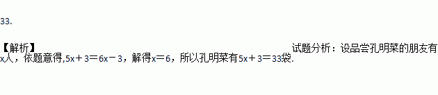 王经理到襄阳出差带回襄阳特产——孔明菜若干袋,分给朋友们品尝.如果每人分5袋,还余3袋;如果每人分6袋,还差3袋,则王经理带回孔明菜_________袋