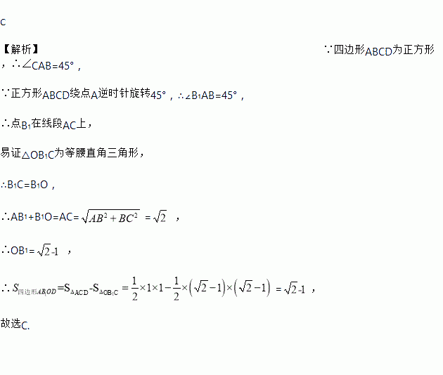 如图,边长为1的正方形ABCD绕点A逆时针旋转45°后得到正方形AB1C1D1,边B1C1与CD交于点O,则四边形AB1OD的面积是( )