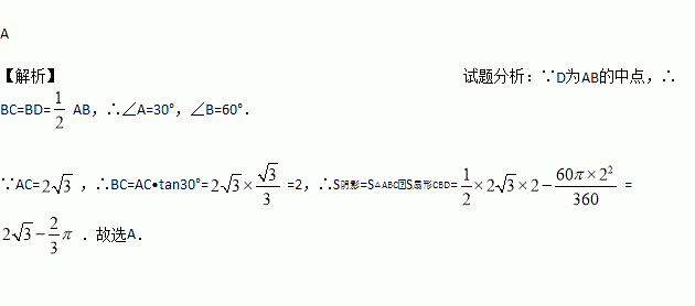 如图,在Rt△ABC中,∠ACB=90°,AC=,以点B为圆心,BC的长为半径作弧,交AB于点D,若点D为AB的中点,则阴影部分的面积是( )