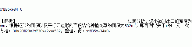 如图,某单位准备将院内一块长30m,宽20m的长方形花园中修两条纵向平行和一条横向弯折的小道,剩余的地方种植花草,如图,要使种植花草的面积为532m2,设小道进出口的宽度为x m,根据条件,可列出方程:____________.