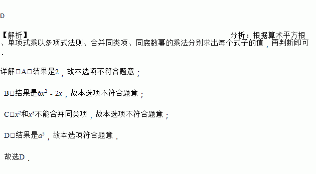 A. (2a2)2=2a4 B. 6a8÷3a2=2a4 C. 2a2•a=2a3 D. 3a2﹣2a2=1