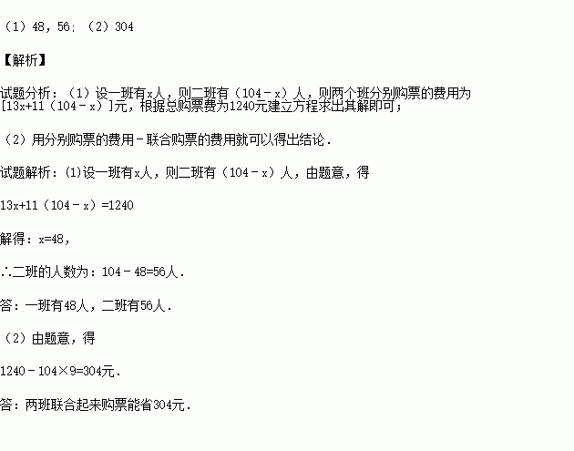 某校初一(1)、(2)两个班共104人去参观世界珍稀动物展览.每班人数都在60以内,其中(1)班人数较少,不到50人.该展览的门票价格规定:单张票价格为13元;购票人数在51﹣100人每人门票价为11元;100人以上每人门票价为9元.经估算,如果两班都以班为单位分别购票,则一共应付1240元;如果两班联合起来,作为一个团体购票,则可以节省不少钱.