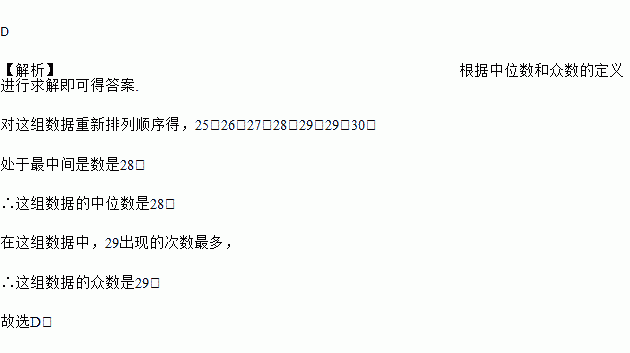 据统计,某住宅楼30户居民五月份最后一周每天实行垃圾分类的户数依次是:27,30,29,25,26,28,29,那么这组数据的中位数和众数分别是( )