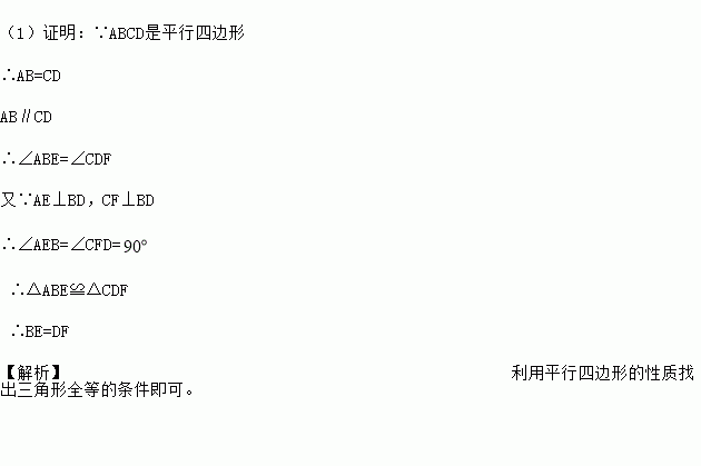 已知:如图,□ABCD中,BD是对角线,AE⊥BD于E,CF⊥BD于F. 求证:BE=DF.