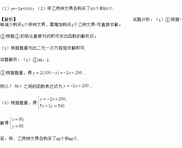 (1)y=-2x+100;(2)甲乙两种文具各购买了60个和80个. 【解析】试题分析:(1)①根据“每减少购买1个甲种文具,需增加购买2个乙种文具”可直接求解; ②根据①的结论直接列式即可求出函数的解析式; (2)根据题意列出二元一次方程组求解即可. 试题解析:(1)①99,2. ②根据题意,得. 所以与之间的函数表达式为. (2)根据题意,得 解...