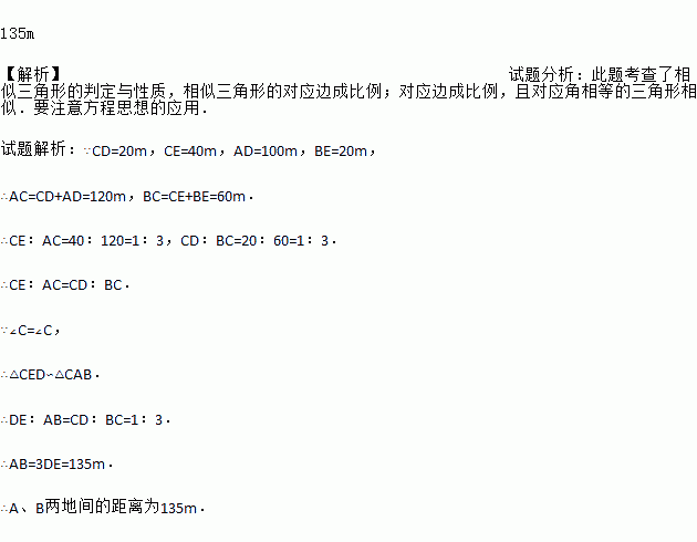 如图,点D、E分别在AC、BC上,如果测得CD=20m,CE=40m,AD=100m,BE=20m,DE=45m,求A、B两地间的距离。