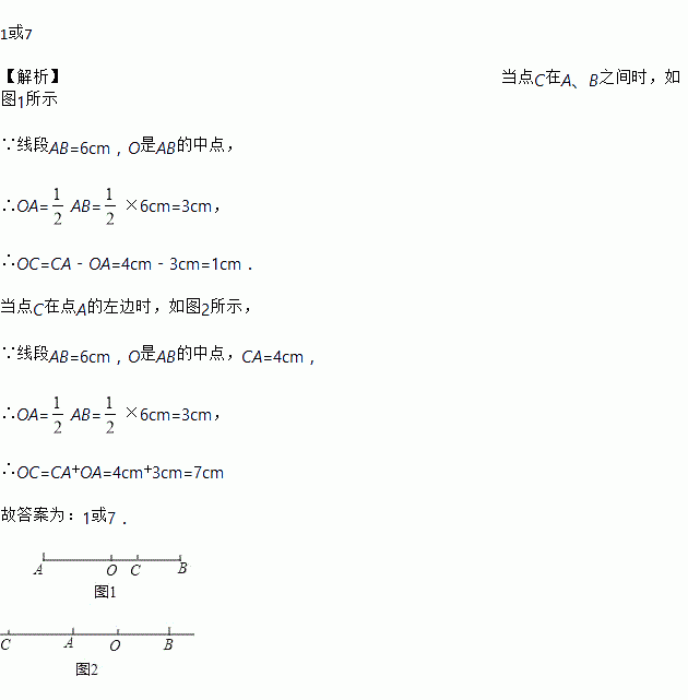 已知线段AB=6cm,点C在直线AB上,且CA=4cm,O是AB的中点,则线段OC的长度是_____cm.