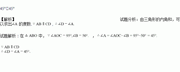 如图所示,直线AD和BC相交于O,AB∥CD,∠AOC=95°,∠B=50°,求∠A和∠D.