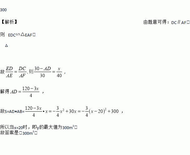如图,在一个直角三角形的内部作一个矩形ABCD,其中AB和AD分别在两直角边上,C点在斜边上.设矩形的一边AB=xm,矩形的面积为ym2,则y的最大值为________.