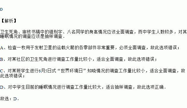 D. 对中学生目前的睡眠情况进行调查
