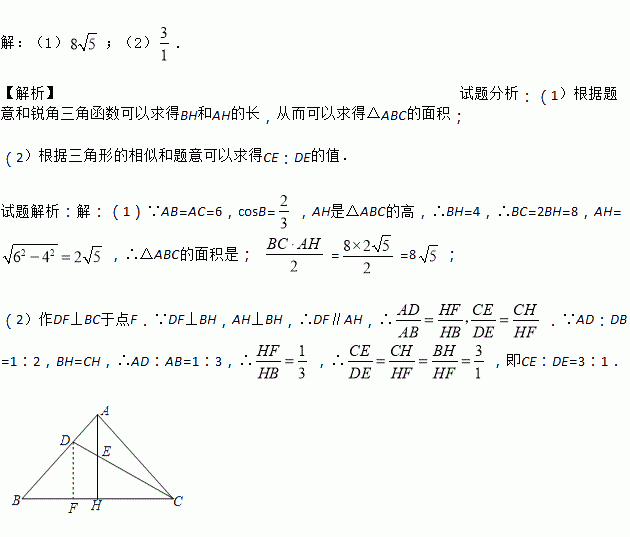 如图,AH是△ABC的高,D是边AB上一点,CD与AH交于点E.已知AB=AC=6,cosB=,