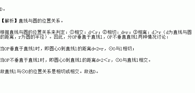 已知⊙O的半径为2,直线l上有一点P满足PO=2,则直线l与⊙O的位置关系是【 】