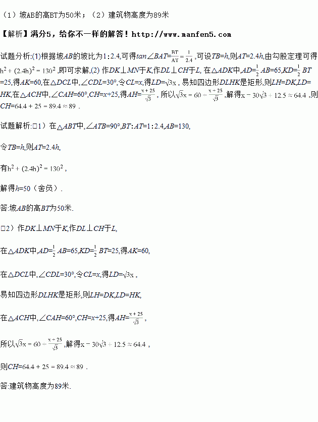 如图,坡AB的坡比为1:2.4,坡长AB=130米,坡AB的高为BT.在坡AB的正面有一栋建筑物CH,点H、A、T在同一条地平线MN上.