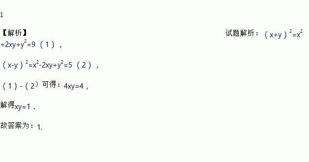 1 【解析】试题解析:(x+y)2=x2+2xy+y2=9 (1), (x-y)2=x2-2xy+y2=5 (2), (1)-(2)可得:4xy=4, 解得xy=1. 故答案为:1.