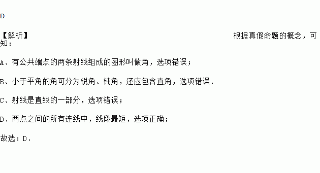D 【解析】根据真假命题的概念,可知: A、有公共端点的两条射线组成的图形叫做角,选项错误; B、小于平角的角可分为锐角、钝角,还应包含直角,选项错误. C、射线是直线的一部分,选项错误; D、两点之间的所有连线中,线段最短,选项正确; 故选:D.