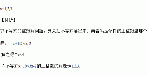 在不等式x+10>3x-2解集中正整数的解是_______________.