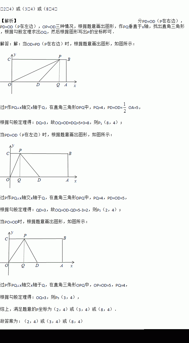 已知:如图,O为坐标原点,四边形OABC为矩形,A(10,0),C(0,4),点D是OA的中点,点P在BC上运动,当△ODP是腰长为5的等腰三角形时,则P点的坐标为_____.