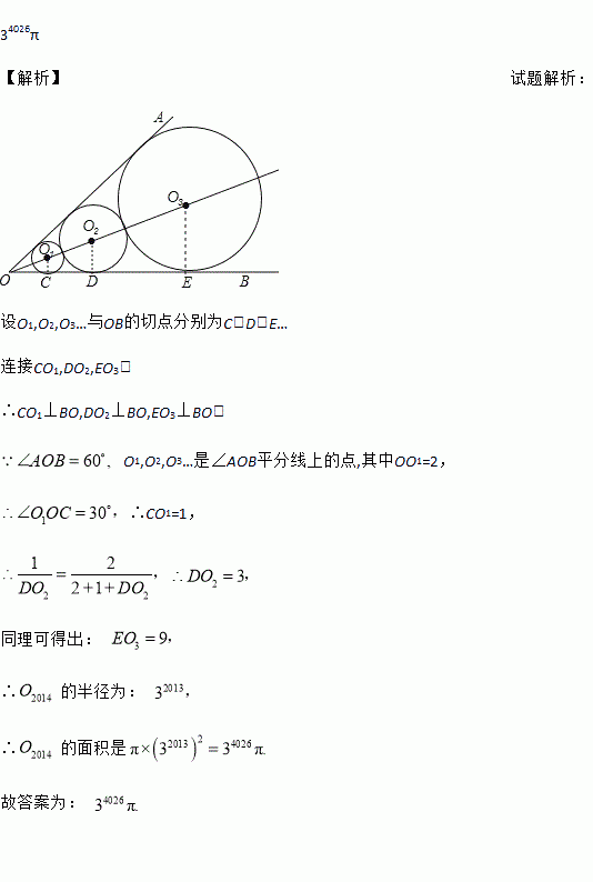 .(2014•福建龙岩)如图,∠AOB=60°,O1,O2,O3…是∠AOB平分线上的点,其中OO1=2,若O1,O2,O3…分别以为圆心作圆,使得⊙O1,⊙O2,⊙O3…均与∠AOB的两边相切,且相邻两圆相外切,则⊙O2014的面积是________(结果保留π)