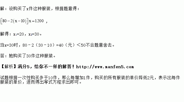 小丽为校合唱队购买某种服装时,商店经理给出了如下优惠条件:如果一次性购买不超过10件,单价为80元;如果一次性购买多于10件,那么每增加1件,购买的所有服装的单价降低2元,但单价不得低于50元.按此优惠条件,小丽一次性购买这种服装付了1200元.请问她购买了多少件这种服装?