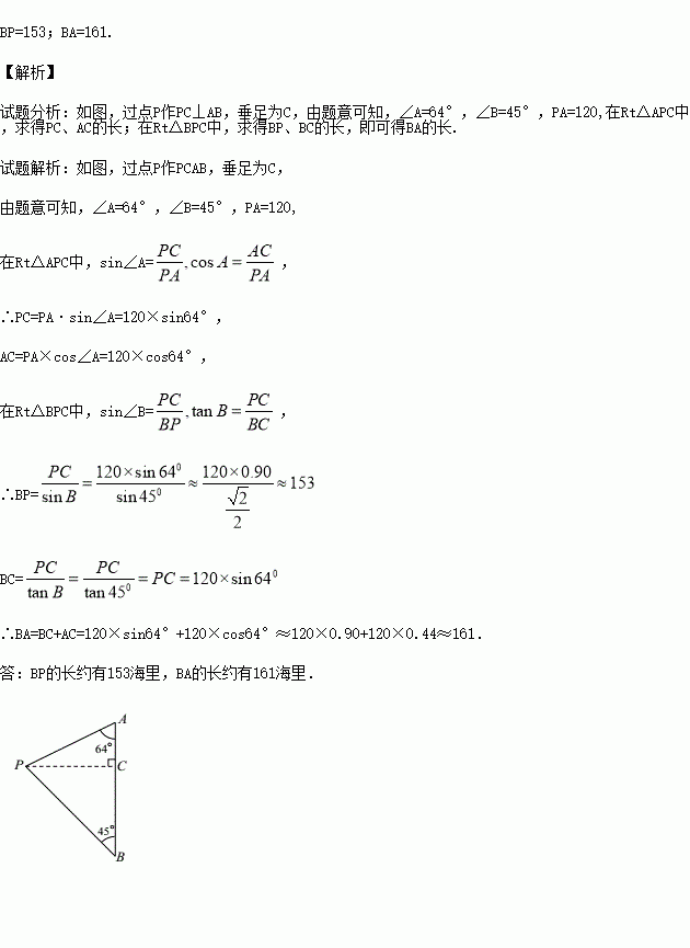 如图,一艘海轮位于灯塔的北偏东方向,距离灯塔120海里的处,它沿正南方向航行一段时间后,到达位于灯塔的南偏东方向上的处,求和的长(结果取整数).