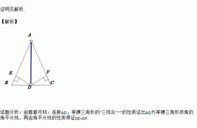 已知:如图,在△ABC中,AB=AC,BD=CD,DE⊥AB于E,DF⊥AC于F.求证:DE=DF.