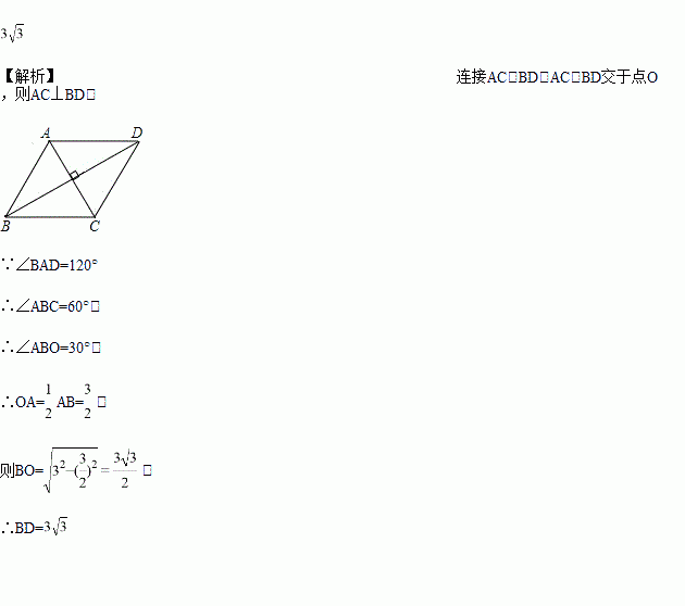 菱形ABCD,∠BAD=120°,且AB=3,则BD=_____
