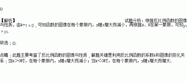 若点A(1,y1)、B(2,y2)在反比例函数y=的图像上,则y1、y2的大小关系为( )