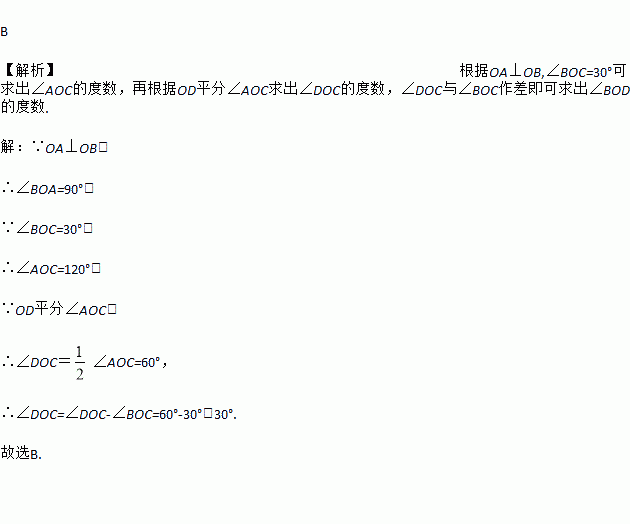 (2017·四川泸州泸县期末)如图,OA⊥OB,∠BOC=30°,OD平分∠AOC,则∠BOD的大小是( )